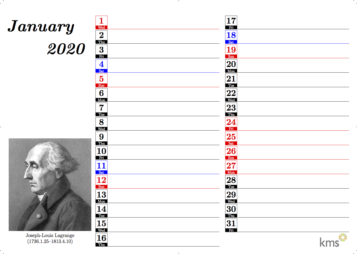 보통 달력의 그림에 해당하는 쪽에 일자별로 메모할 수 있게 빈칸을 그렸다. 이것만 하면 심심해서, 각 달에 태어난 수학자 초상화를 넣어 보았다.