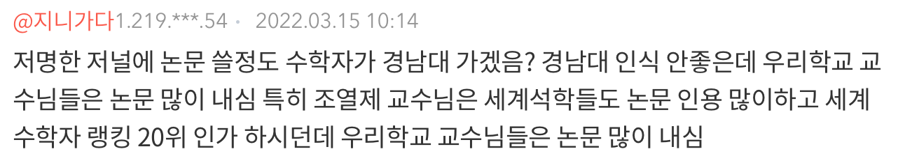 이 글에 붙은 댓글. 수준이 적나라하게 드러나 보이는데 부끄럽지도 않은가 보다. 이런 댓글이 조열제 교수님까지 욕보인다는 건 생각 못하겠지. 애초에 경상대 학생도 아니겠지만.