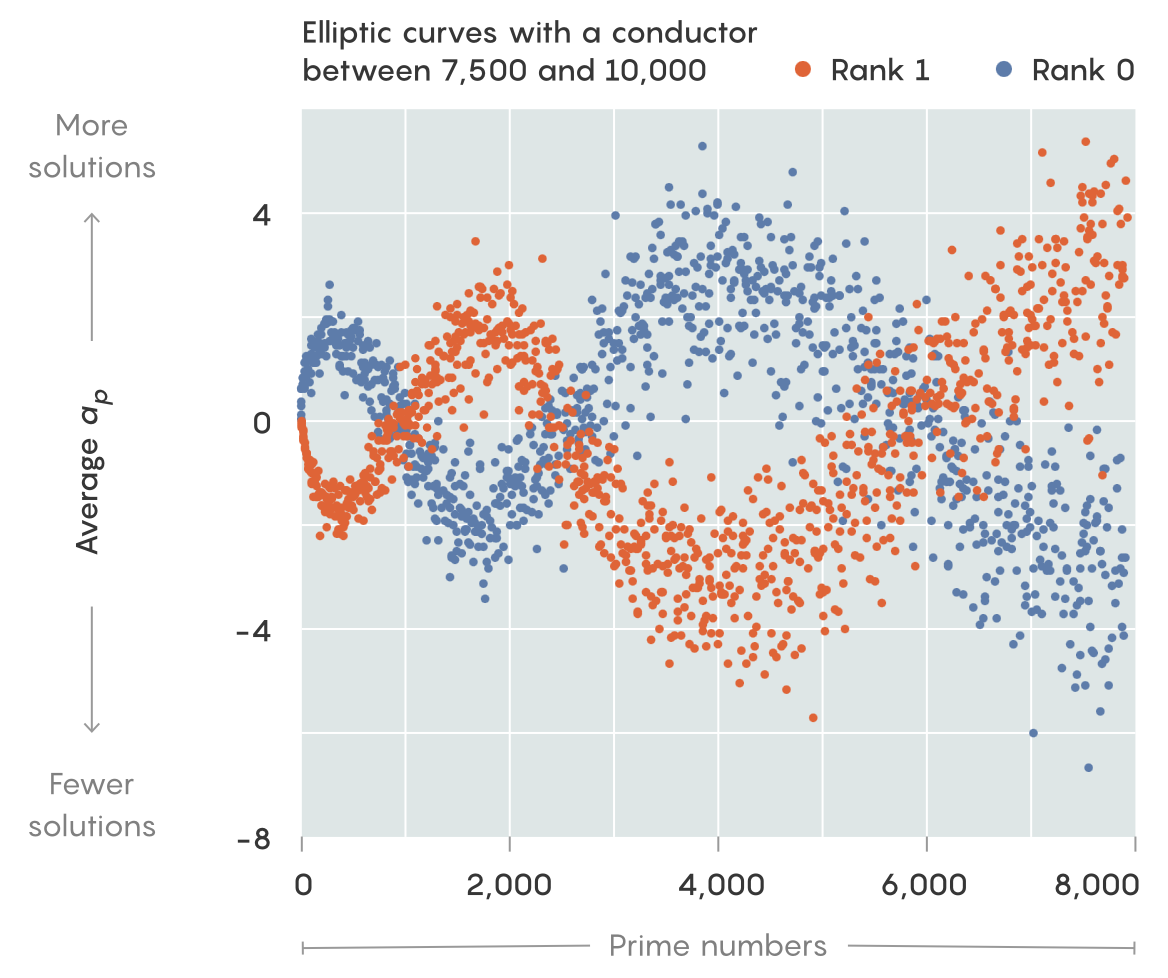 기계학습이 늘 그렇듯, 잘 작동하는 이유를 알기는 어려웠는데, 이규환 교수가 학부생에게 이 결과들을 연구해 보라고 했더니, 놀라운 현상이 발견되었다. 타원곡선들을 rank 0과 rank 1로 나눈 다음, 계산했던 값들을 소수에 따라 평균을 내어 그래프를 만들어 보니, 마치 수많은 새들이 무리지어 날아가는 것처럼 물결치는 듯한 패턴이 나타났다.